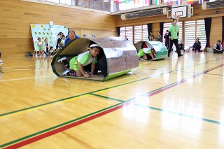 親子で、カメの甲羅に見立てたキャタピラーで途中まで進み、